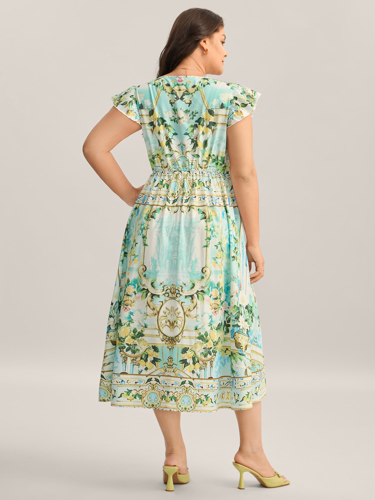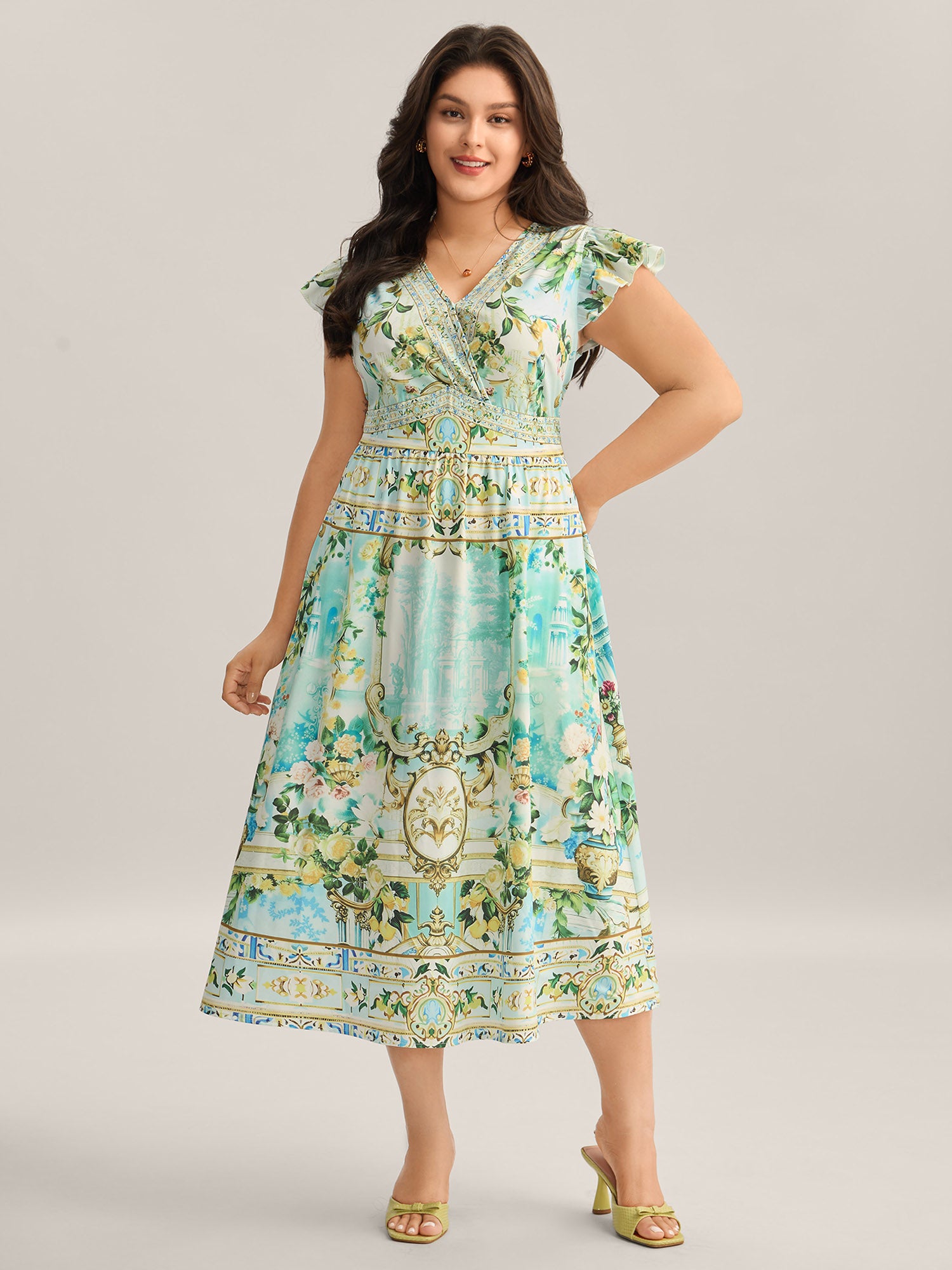 Breezy Print Surplice Neck Ruffled Midi Dress