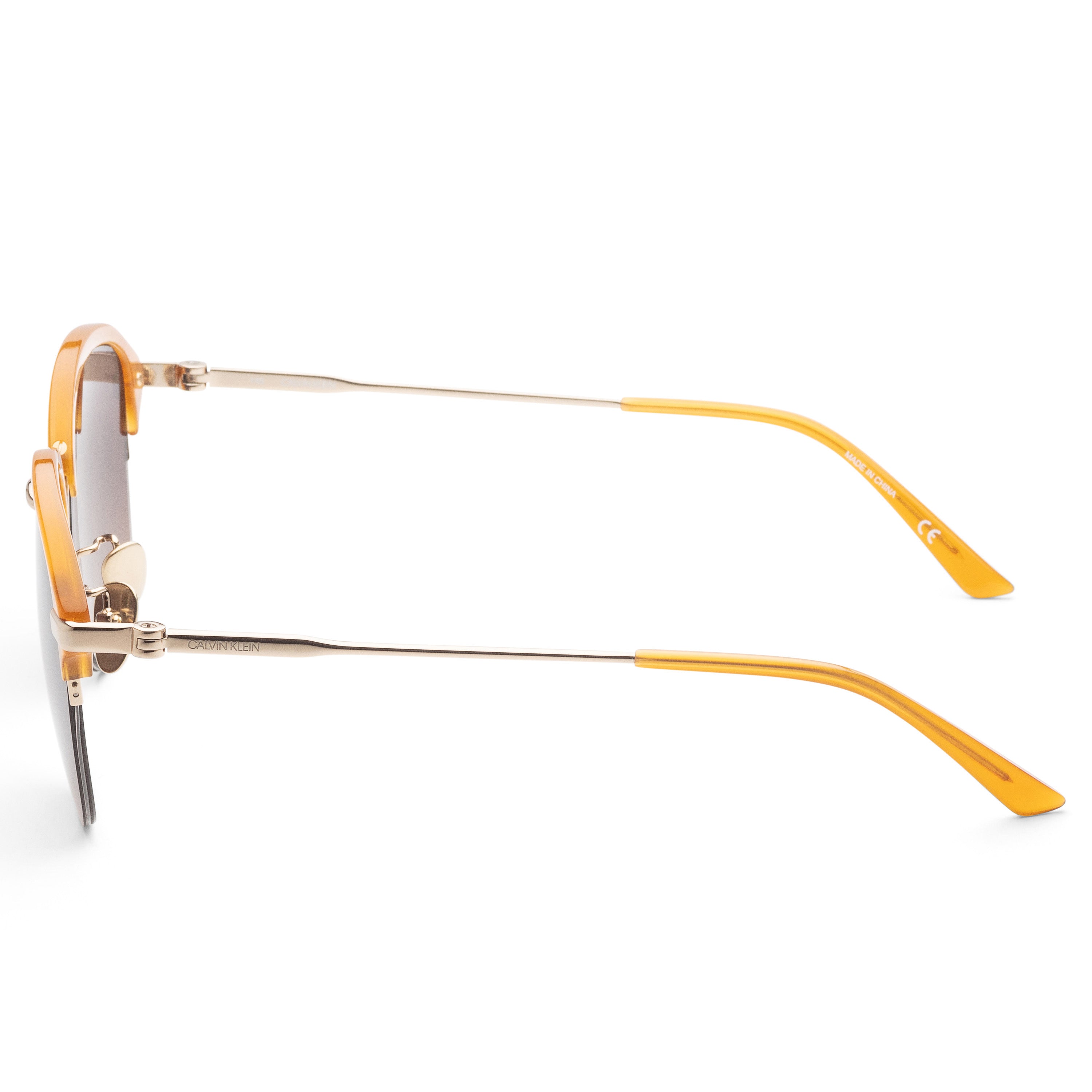 The calthtvin klethtin men's Sunglasses measure at 56 mm lens width, 20 mm bridge width, and 140 mm arm length. The frame is square-shaped milky amber metal and plastic. The lenses are non-polarized brown. Made in China (CK18717SK-702)