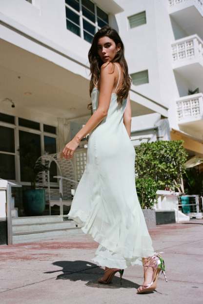 Introducing the Chesley Dress. This pretty, Y2K-inspired piece stuns with a washed sage chiffon fabric. The bias slip dress debuts with an asymmetrical silhouette, double layer construction at the cowl neck, a fitted underlayer, double spaghetti straps, and an easy pull on fit. This piece comes fully lined.