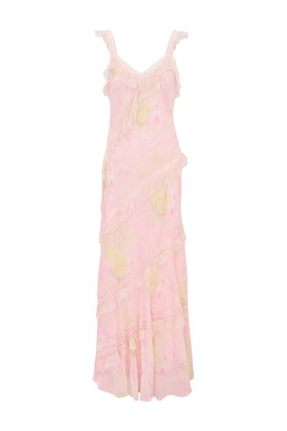 Daydreams come true in the Radiance Dress. This dreamy maxi returns with a mixed printed chiffon fabric featuring large-scale ikat florals. With an airy and breezy silhouette, the dress is stripped with delicate laces all over sourced from vintage textiles. The pieces begin with lace straps that fall to tiny flutter sleeves that fall to an easy skirt with tiny ruffle details all over.